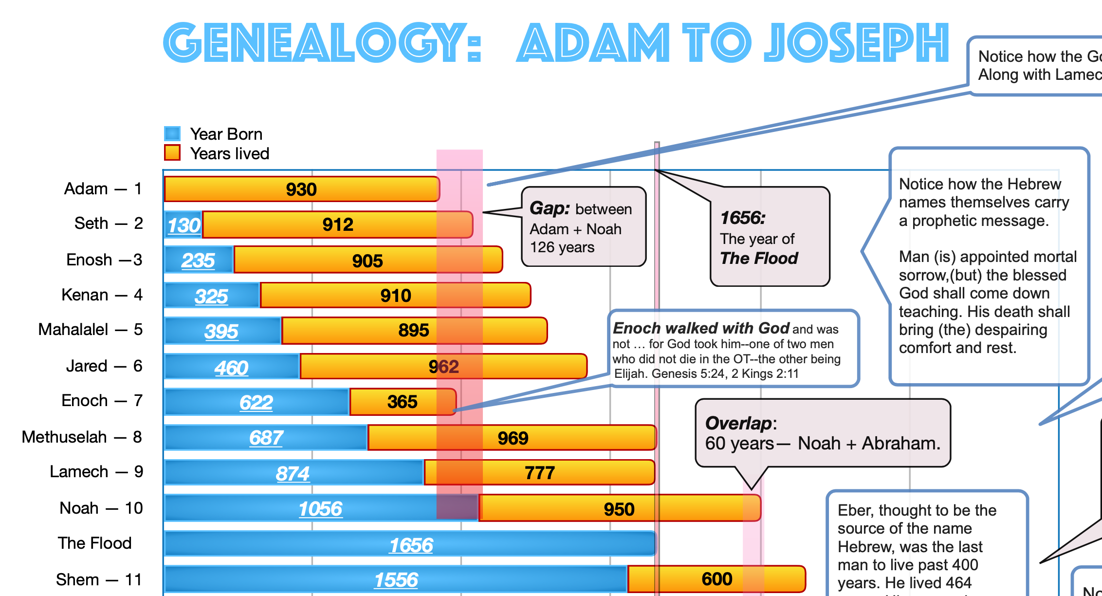 Name: Methuselah = “His Death Shall Bring.” Prophecy: Methuselah’s death will bring the End of the World. Result: Methuselah was Enoch’s Son, and Noah’s grandfather. He was a prophet of God. It is likely he raised a righteous family (son, and grandson). He probably knew Adam and Eve personally, having met them face to face. It is likely He heard and kept their testimony, and sacrificed to the one and only true God (even as they taught Abel to sacrifice to God), carrying on the Blood Covenant of God passed down to him through his family. His Father, Enoch was a prophet who walked with God in a supernatural relationship. (Here’s a riddle, Enoch lived the shortest recorded life of Noah’s lineage, but also the Longest.) Enoch named his son, Methuselah prophetically, according to the Word of the Lord. Methuselah died in the year of the flood the oldest recorded living human being, living 969 years (only 31 years short of one full millennia). The length of his life is a prophetic message all in itself. The world of men had 969 years to correct their evil doings, but they refused to do so, and instead “the rulers of men only hardened their hearts all the more and dove more carelessly into lies, sins, violence, murders, extortions, kidnappings, rape, pillaging, witchcraft, demonic idol worship, human sacrifice, and far worse. They only increased, extended, and deepened their evil deeds and their evil control over all the people. So as God proclaimed, in the end Methuselah’s death would bring the destruction of the human race, all except for his grandson, Noah.