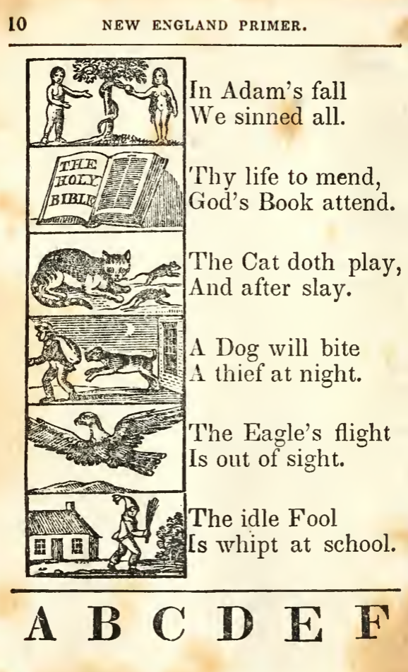 It introduces the English Alphabet using vivid imagery from the Bible. It is written in King James English which is a helpful introduction the the King James Bible. And it presents a Protestant Pilgrim view of discipline that is not afraid of spanking and just punishment, to correct children who might try to choose to wander away from discipline and good judgment.